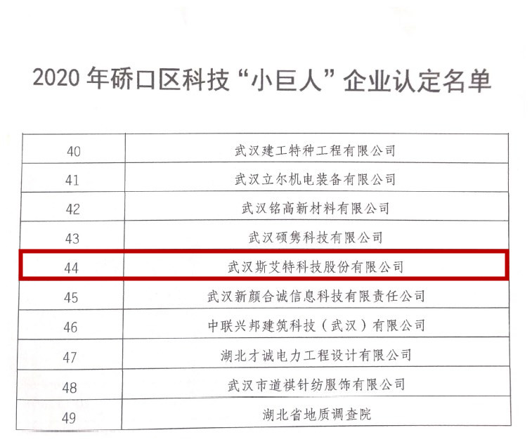 公示名單顯示,此次共49家企業(yè)被認(rèn)定為2020年硚口區(qū)科技”小巨人”企業(yè) 。斯艾特科技獲此榮譽,是對我們企業(yè)的認(rèn)可和支持,也是促進我們企業(yè)創(chuàng)新能力轉(zhuǎn)化,為服務(wù)行業(yè)和社會具有重大意義。