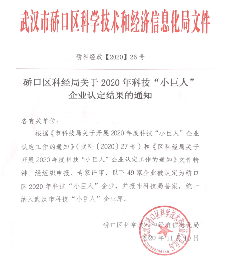 近日,武漢市硚口區(qū)科學(xué)技術(shù)和經(jīng)濟信息化局公示了《2020年硚口區(qū)科技“小巨人”企業(yè)認(rèn)定名單》。作為智慧化綜合管理解決方案提供商,斯艾特科技經(jīng)過組織申報與專家評審?fù)ㄟ^,被認(rèn)定為硚口區(qū)2020年科技“小巨人“企業(yè)。這是斯艾特科技繼獲得“高新技術(shù)企業(yè)”、“中國安防百強工程商”等榮譽后又一具有技術(shù)含量的殊榮。